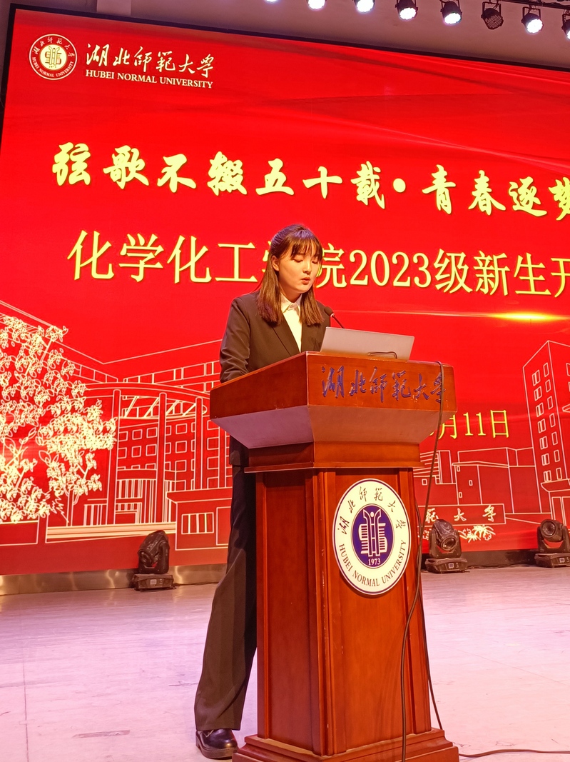 赵梦晓作为老生代表发言。她首先对在化院遇到许多认真负责的老师表示感谢,随后讲述了自身学习与科研经历,与学弟学妹们交流了自己的学习经验和心得体会,告诫大家要尽快转变生活学习方式,尽早做好大学生涯规划,鼓励同学们在充满无限可能的大学中不断探索,创造自己的青春华章。