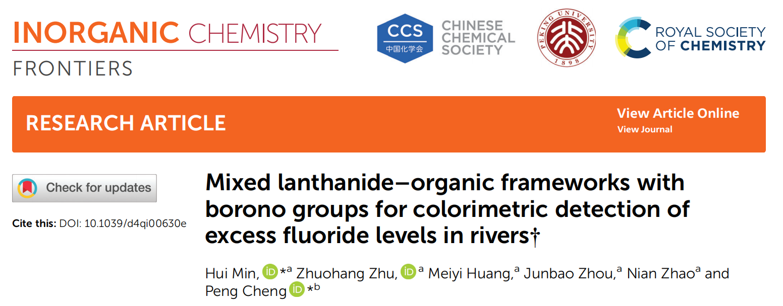 近日,国际知名期刊Inorganic Chemistry Frontiers(《无机化学前沿》)在线刊发了我院闵辉博士在离子识别领域的最新研究成果。论文题为“Mixed lanthanide-organic frameworks with borono groups for colorimetric detection of excess fluoride levels in rivers”(含硼酸基团的混合镧系金属-有机框架用于江水中过量氟离子含量的比色法检测)。闵辉博士为论文第一作者兼通讯作者,南开大学程鹏教授为共同通讯作者,伟德victor1946为论文第一通讯单位。Inorganic Chemistry Frontiers收录无机化学及相关领域具有高影响力的跨学科研究成果,是中科院SCI化学大类一区期刊,最新影响因子为7.0。