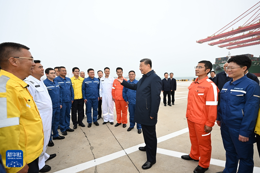 5月22日至24日,中共中央总书记、国家主席、中央军委主席习近平在山东考察。这是22日下午,习近平在日照港亲切慰问港口科技工作者、运营人员、航运人员。 新华社记者 鞠鹏 摄