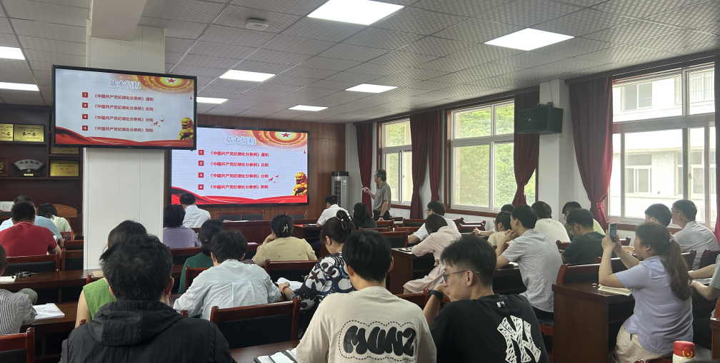 集中研讨暨警示教育以5月份教师党支部主题党日形式进行。在重温入党誓词、诵读党章第七章“党的纪律”、缴纳5月份党费后,罗鸿飞为全体党员教师讲授主题党课《中国共产党纪律处分条例(2023年修订)(第2-5章)》,带领大家逐条逐句对《条例》进行学习。