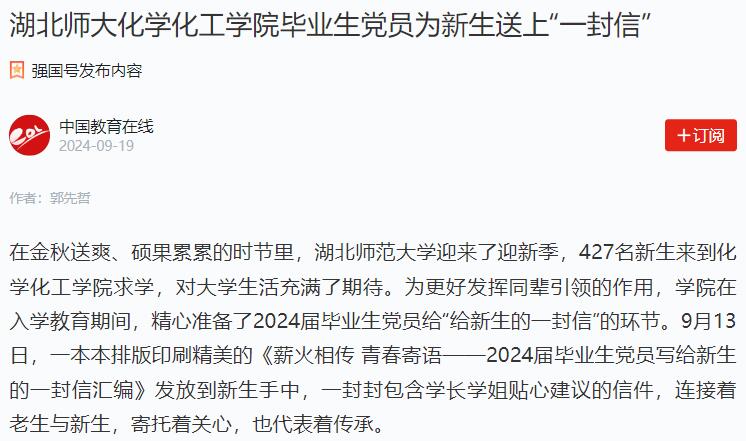 如何做好新生入校后的朋辈引导,使其尽快适应大学生活;如何发挥毕业生党员的“传帮带”作用,使其能够影响带动更多学生。以毕业生党员们自身的成长经历为主要内容的“经验帖”型书信是一个很好的选择。为发挥党员先锋模范作用,引导2024 级新生脚踏实地、志存高远,经研究,学院组织开展“薪火相传 青春寄语—2024 届毕业生党员写给新生的一封信”活动。经过前期准备,近期已将书信发放到学生手中,后续还将通过开展阅读心得交流、学生党员对接寝室等多种形式进一步发挥其作用。近日,“学习强国”学习平台对学院的以上做法进行了报道。