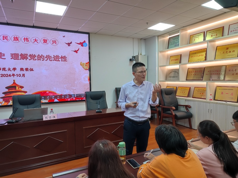 熊荣伍指出,我们党是先进的政党,自诞生之日起就把先进性建设作为党的建设的核心内容,党的先进性建设贯穿于党领导新民主主义革命、社会主义革命和建设、改革开放和社会主义现代化建设新时期以及中国特色社会主义新时代的百年历程中,其先进性体现在党的指导思想、根本宗旨、精神品质、自身建设等多方面方面,并结合“窑洞对”“赶考对”、抗美援朝战争、南巡讲话、新冠肺炎疫情防控等具体事件进行了深入阐述。