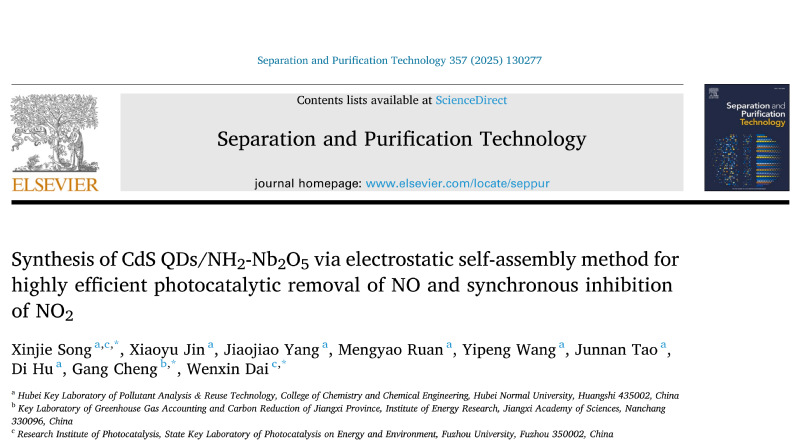 近日,国际知名期刊Separation and Purification Technology(《分离纯化技术》)在线发表了我院宋昕杰博士团队在光催化去除氮氧化物领域的最新研究成果。论文题为“Synthesis of CdS QDs/NH2-Nb2O5 via electrostatic self-assembly method for highly efficient photocatalytic removal of NO and synchronous inhibition of NO2”(通过静电自组装法合成CdS QDs/NH2-Nb2O5用于高效光催化去除NO并抑制NO2生成)。宋昕杰博士为论文第一作者和通讯作者,江西省科学院程刚副研究员和福州大学戴文新研究员为论文共同通讯作者,伟德victor1946为论文第一单位。Separation and Purification Technology是ELSEVIER(爱思唯尔)出版社旗下工程技术领域期刊、SCI中科院大类一区期刊,最新影响因子为8.1。