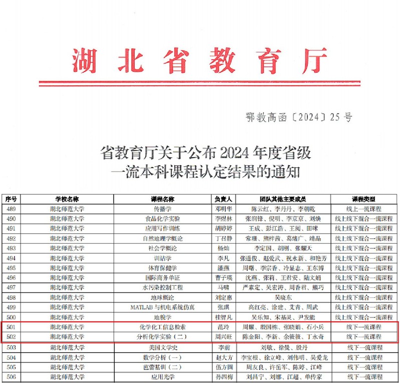 近日,省教育厅印发《关于公布2024年度省级一流课程认定结果的通知》(鄂教高函〔2024〕25号),我院范玲老师教学团队(周耀、殷国栋、张晓娟、石小兵)主讲的《化学化工信息检索》和周兴旺老师教学团队(陈金阳、李新、余筱筱、丁永奇)主讲的《分析化学实验(二)》获批省级线下一流课程。