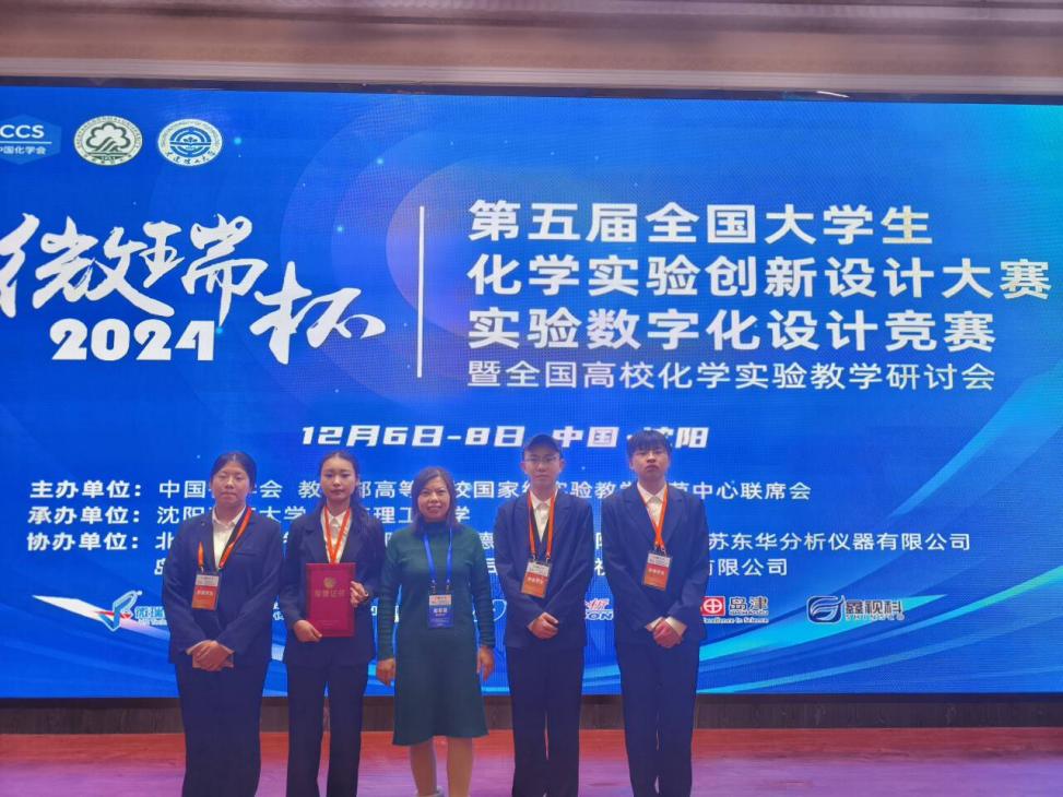 第五届全国大学生化学实验创新设计大赛-实验数字化设计竞赛于12月6-8日在沈阳师范大学举行,赛事由中国化学会、教育部高等学校国家级实验教学示范中心联席会主办,沈阳师范大学和大连理工大学联合承办。我院化学专业2202班饶玉、高佳丽、周奇、刘尧及计算机与信息工程学院通信工程专业2105班邢亮5名同学组建的伟德victor1946三队通过激烈角逐进入全国总决赛,获得全国二等奖,指导老师为我院物理化学教研室程翠霞副教授和计算机与信息工程学院黄琳老师。