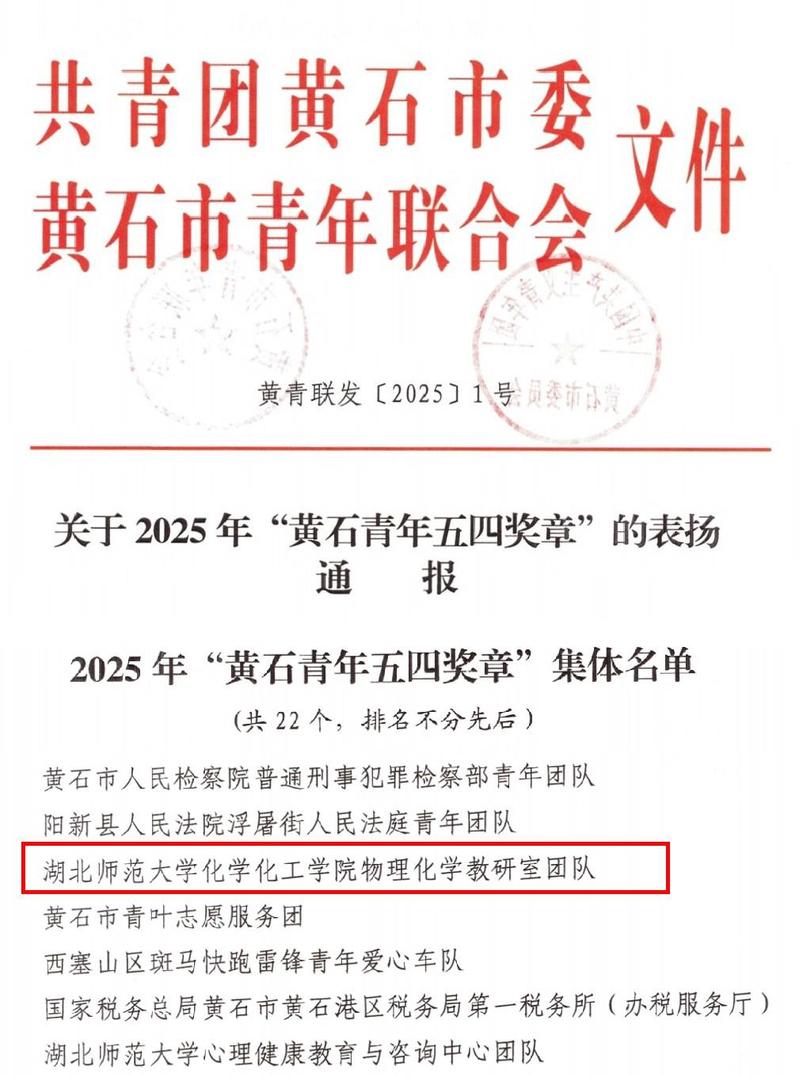 日前,为集中展示新时代黄石青年在各行各业的突出表现,激励广大青年担当作为,攻坚克难,更好弘扬时代精神,为黄石高质量发展贡献青春力量,共青团黄石市委、黄石市青年联合会决定,对46名2025年“黄石青年五四奖章”个人、22个2025年“黄石青年五四奖章”集体进行通报表扬。我院物理化学教研室团队荣获2025年“黄石青年五四奖章”集体称号。