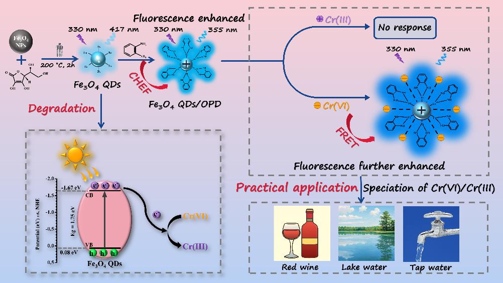 该研究基于四氧化三铁量子点(Fe3O4 QDs),构建Fe3O4 QDs /邻苯二胺(OPD)荧光传感分析Cr(III)/Cr(VI)的形态以及Fe3O4 QDs光催化降解还原Cr(VI)为Cr(III)的新技术。Fe3O4 QDs与OPD之间通过Fe-N螯合作用,荧光强度比Fe3O4 QDs增强1.47倍,同时伴随波长从417 nm蓝移到355 nm。随着Cr(VI)的加入,由于静电作用和荧光共振能转移机制,Fe3O4 QDs/OPD荧光强度进一步线性增强,而Fe3O4 QDs/OPD对Cr(III)没有任何响应,因此成功建立了两步连续荧光增强,Fe3O4 QDs/OPD快速检测Cr(VI)/Cr(III)形态分析新方法,Cr(VI)的检出限低至2.44 ng·mL-1。此外,Fe3O4 QDs具有纳米生物酶的特性,在pH 4的条件下,展现了优异的光催化还原降解Cr(VI)为无毒的Cr(III)的性能,在2 h内降解99%以上的Cr(VI),为环境去除和治理Cr(VI)提供高效、绿色、便捷的新方法。这些结果突显了Fe3O4 QDs既可作为Cr(VI)/Cr(III)形态分析的荧光探针,又可作为纳米酶光催化降解还原Cr(VI)为Cr(III),Fe3O4 QDs的双重作用,不仅拓展了Fe3O4 QDs的应用范围,也为纳米酶的应用提供了新思路。