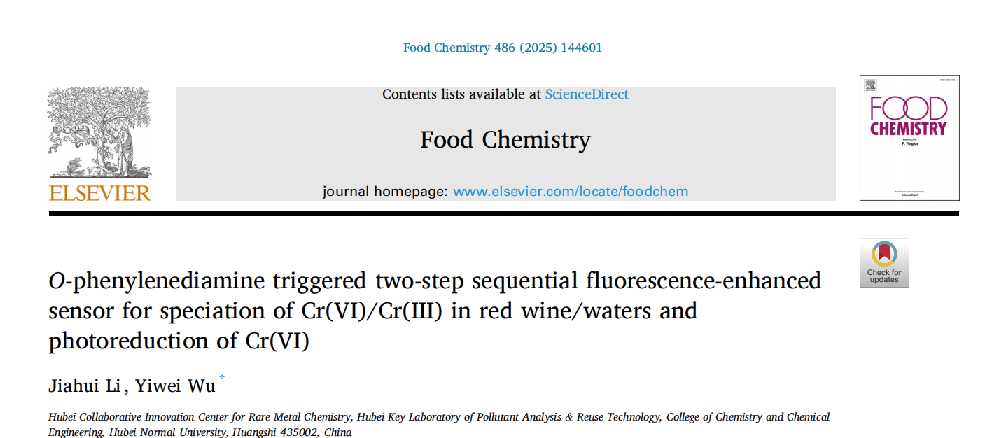 日前,分析化学教研室吴一微教授团队在国际知名期刊Food Chemistry(《食品化学》)在线发表最新研究成果,论文题为“O-phenylenediamine triggered two-step sequential fluorescence-enhanced sensor for speciation of Cr(VI)/Cr(III) in red wine/waters and photoreduction of Cr(VI)”(《邻苯二胺触发两步连续荧光增强传感器测定红葡萄酒/水中Cr(VI)/Cr(III)的形态及Cr(VI)的光还原新技术》)。2022级研究生李佳卉为论文第一作者,吴一微教授为通讯作者,伟德victor1946为论文唯一通讯单位。Food Chemistry是中科院一区top期刊,最新影响因子为8.5。