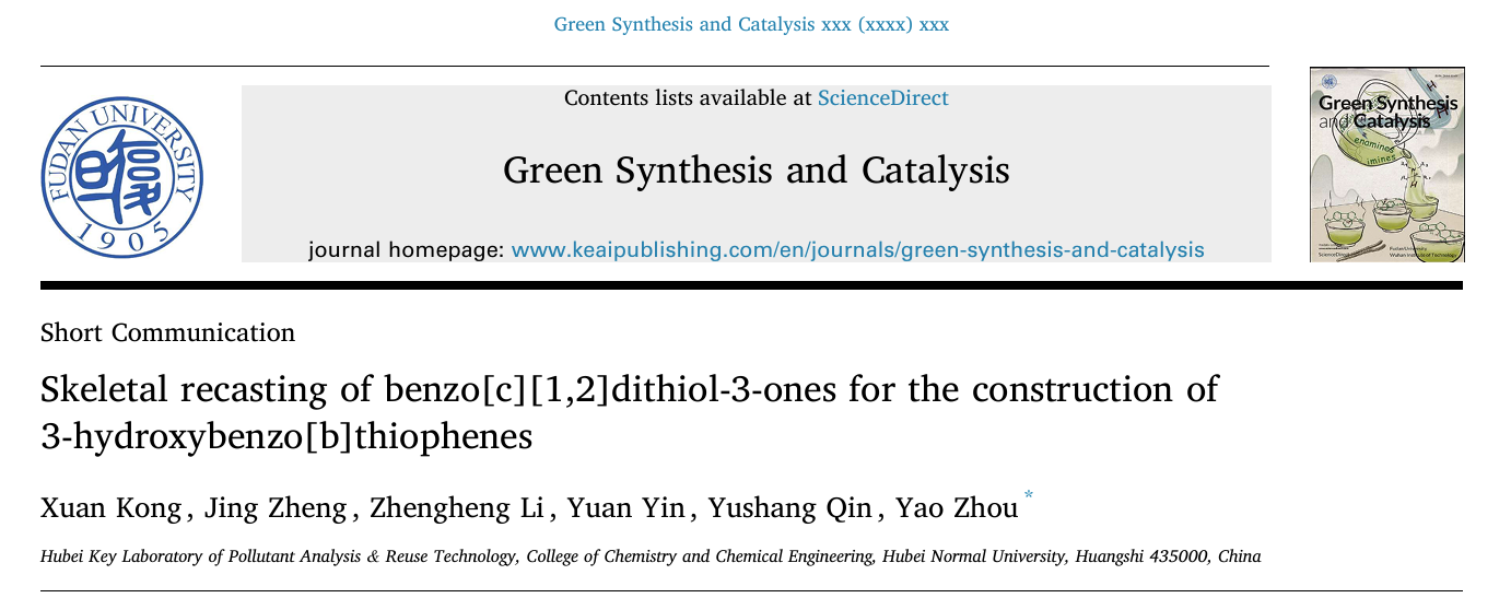 近日,国际知名期刊Green Synthesis and Catalysis(《绿色合成与催化》)在线发表了化工工艺教研室周耀副教授在分子骨架编辑领域的最新研究成果。论文题为“Skeletal recasting of benzo[c][1,2]dithiol-3-ones for the construction of 3-hydroxybenzo[b]thiophenes”(苯并二磺酚酮的骨架重组构建3-羟基苯并噻吩)。我院2023级硕士研究生孔暄为论文第一作者,周耀博士为论文通讯作者,伟德victor1946为论文唯一通讯单位。Green Synthesis and Catalysis是ELSEVIER(爱思唯尔)出版社旗下绿色合成与催化领域期刊、中科院大类一区期刊,最新影响因子为6.3。