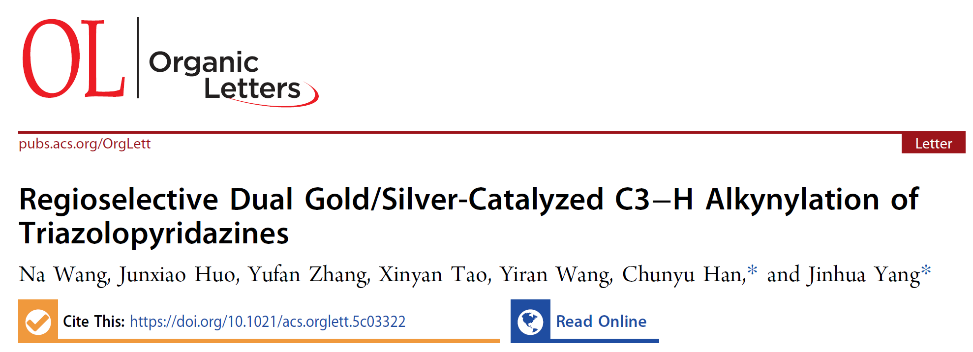 近日,国际知名期刊Organic Letters(《有机化学通讯》)在线发表了有机化学教研室韩春雨博士和杨进华副教授团队在金催化领域的最新研究成果。论文题目为“Regioselective Dual Gold/Silver-Catalyzed C3-H Alkynylation of Tri-azolopyridazines”(区域选择性金/银催化三唑并哒嗪的C3-H炔基化反应)。2024级硕士研究生王娜为论文第一作者,韩春雨博士为第一通讯作者,杨进华副教授为共同通讯作者,伟德victor1946为论文唯一通讯单位。Organic Letters是American Chemical Society(美国化学会)出版社1999年起发行的国际期刊,主要报道有机化学方面的最新研究进展,是中科院一区top期刊、自然指数(Nature Index)期刊,最新影响因子为5.0。