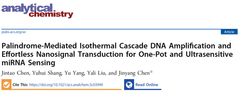 9月,Analytical Chemistry(《分析化学》)在线发表该团队研究成果,论文题为“Palindrome-Mediated Isothermal Cascade DNA Amplification and Effortless Nano-Signal Transduction for One-Pot and Ultrasensitive miRNA Sensing”(《回文介导等温级联DNA扩增与便捷纳米信号转导的miRNA超灵敏一锅法检测》)。我院2022级硕士研究生陈金涛为论文第一作者,陈金阳副教授为论文唯一通讯作者,伟德victor1946为论文唯一通讯单位。Analytical Chemistry是American Chemical Society(美国化学会)出版社旗下分析化学领域顶级期刊,中科院SCI化学大类一区TOP期刊、自然指数期刊,最新影响因子为6.7。