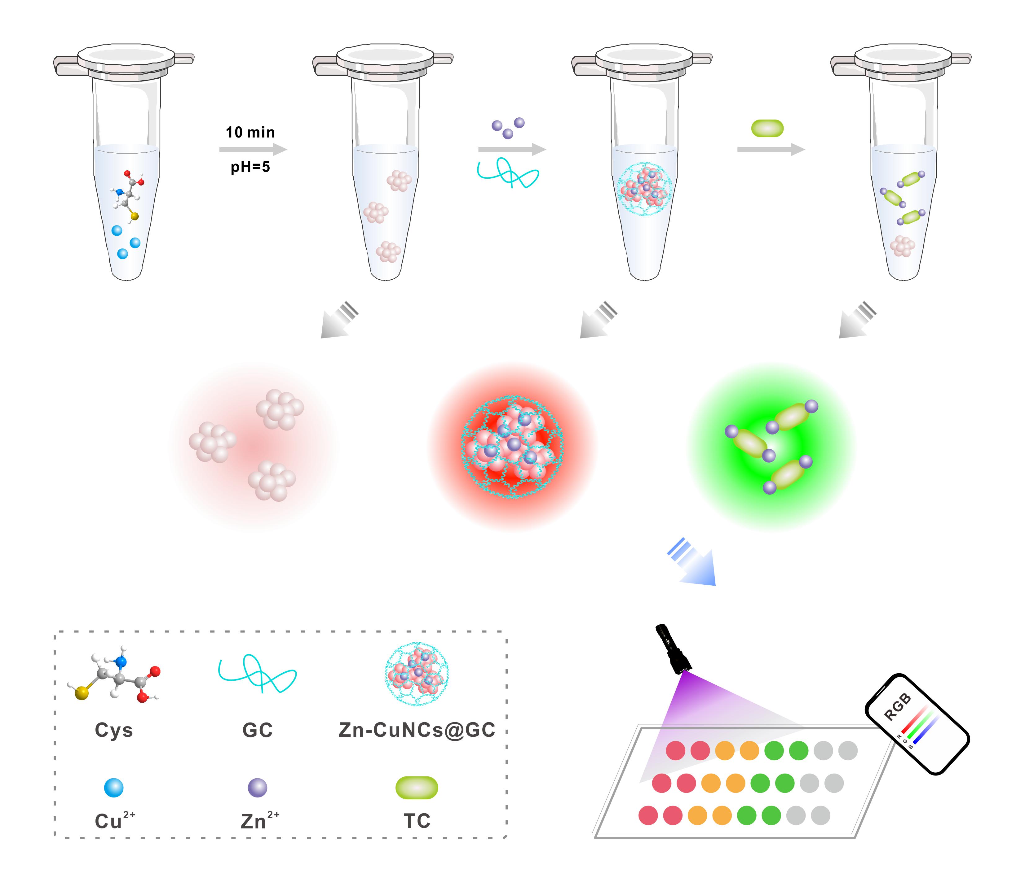 Zn-CuNCs@GC一体化合成及四环素传感原理示意图