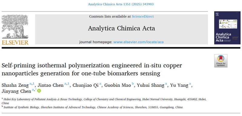 5月,Analytica Chimica Acta(《分析化学学报》)在线发表该团队研究成果,论文题为“Self-priming isothermal polymerization engineered in-situ copper nanoparticles generation for one-tube biomarkers sensing”(《自引发等温聚合调控铜纳米粒原位生成的一管式生物标志物检测》)。我院2021级硕士研究生曾莎莎和2022级硕士研究生陈金涛为论文共同第一作者,陈金阳副教授为论文唯一通讯作者,伟德victor1946为论文唯一通讯单位。Analytica Chimica Acta是Elsevier出版社旗下分析化学领域知名期刊、中科院SCI化学大类二区TOP期刊,最新影响因子为6.0。