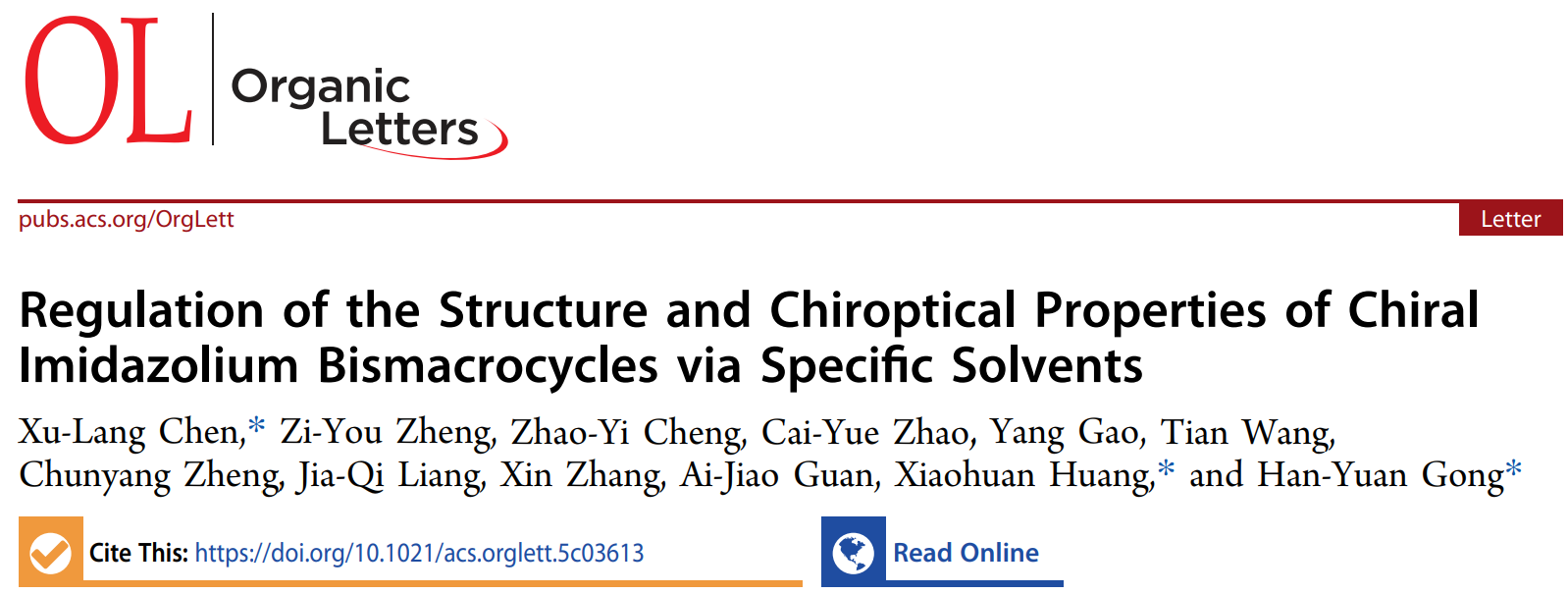 近日,Organic Letters(《有机化学通讯》)在线发表了我院有机化学教研室陈绪朗博士的最新研究成果。论文题目为“Regulation of the Structure and Chiroptical Properties of Chiral Imidazolium Bismacrocycles via Specific Solvents”(通过特定溶剂调控手性咪唑盐双大环的结构与手性光学性质)。陈绪朗博士为论文第一作者兼通讯作者,有机化学教研室黄小欢教授和北京师范大学龚汉元教授为论文共同通讯作者,伟德victor1946为论文第一通讯单位。Organic Letters是American Chemical Society(美国化学会)出版社1999年起发行的国际期刊,主要报道有机化学方面的最新研究进展,是中科院一区top期刊、自然指数(Nature Index)期刊,最新影响因子为5.0。