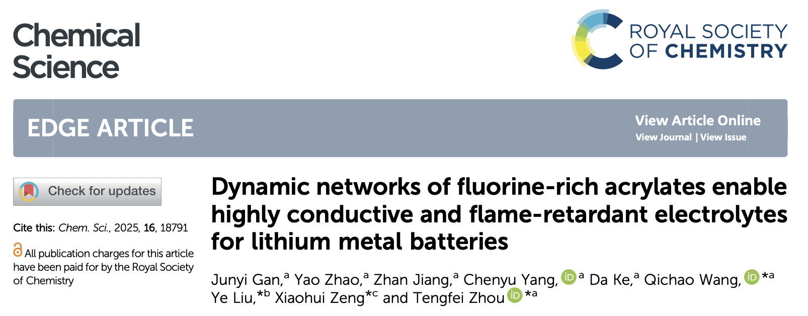 在锂金属电池关键电解质材料方面,研究团队通过原位共聚策略,构建了一种由丙烯酰胺(AM)与富氟丙烯酸酯(HFA)组成的动态凝胶聚合物电解质网络。研究表明,–CF₃ 与C=O官能团之间的协同偶极作用可有效调控锂盐溶剂化结构,促进锂盐解离并构建快速Li⁺ 传输通道,同时通过–NH₂基团对阴离子的锚定显著提高锂离子迁移数。理论计算与多尺度表征结果显示,该动态网络有利于在电极界面形成富含LiF的稳定SEI/CEI层,从而有效抑制锂枝晶生长并提升电池安全性与循环稳定性。电化学测试表明,该凝胶聚合物电解质在室温下实现了1.21 × 10⁻³ S·cm⁻¹的离子电导率和0.68的锂离子迁移数,Li‖Li对称电池可稳定循环超过1000 h,LFP‖Li全电池在200次循环后仍保持约87%的容量保持率。该成果于9月发表于中科院SCI大类一区、自然指数期刊Chem. Sci.(IF:7.9),刘野博士、德国亥姆霍兹研究所曾小慧研究员、安徽大学王启超博士和周腾飞教授为论文共同通讯作者,伟德victor1946为论文第二通讯单位。