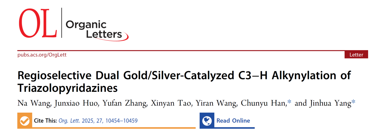 三唑并哒嗪类化合物的结构修饰面临较大挑战,尤其是在其C3位点的直接官能团化方面。该研究克服现有三唑并哒嗪C3位官能团化方法中步骤繁琐、选择性差、条件苛刻等缺陷,提供一种基于金/银双催化体系的区域选择性C3–H炔基化方法。
