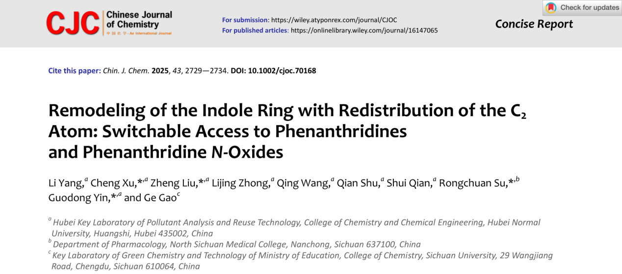该成果于2025年7月作为封面文章发表于中科院SCI大类一区期刊Chinese Journal of Chemistry(IF:5.5),2023级硕士研究生杨丽为论文第一作者,殷国栋教授、徐程副教授、刘郑副教授和川北医学院苏蓉川博士为论文通讯作者,伟德victor1946为论文第一通讯单位。