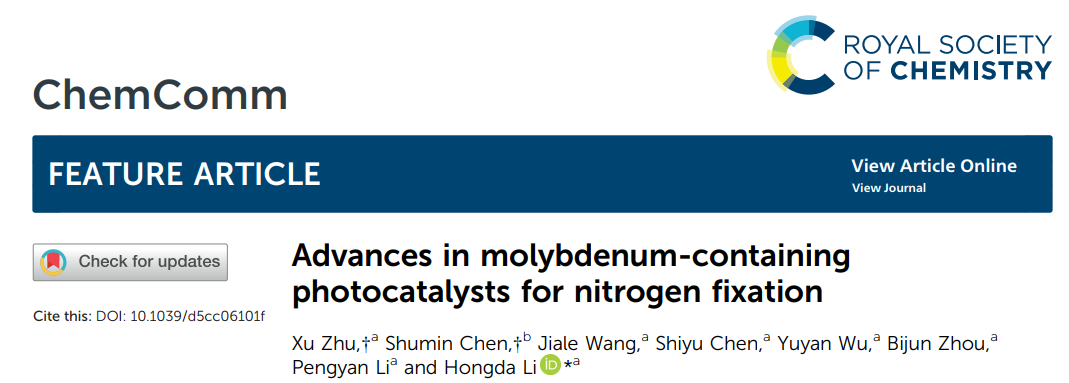 2025年12月,Chemical Communications(《化学通讯》)在线发表了该团队在光催化固氮领域的研究综述,论文题为“Advances in Molybdenum-Containing Photocatalysts for Nitrogen Fixation”(含Mo光催化固氮催化材料的研究进展)。李宏达博士为论文唯一通讯作者,伟德victor1946为论文第一通讯单位,应用化学专业2305班本科生朱旭与荆楚理工学院陈淑敏教授为论文共同第一作者。Chemical Communications是自然指数期刊、中科院二区TOP期刊,最新影响因子为4.2。