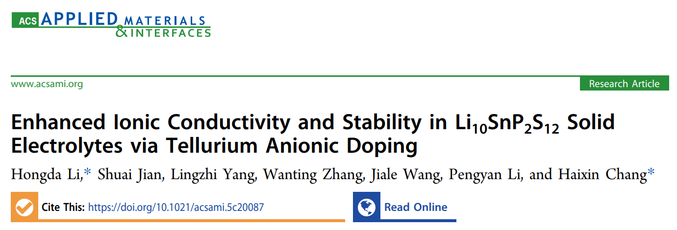 2025年11-12月,ACS Applied Materials & Interfaces(美国化学会《应用材料与界面》)和Journal of Materials Chemistry A(《材料化学A》)分别在线发表了该团队题为“Enhanced Ionic Conductivity and Stability in Li10SnP2S12 Solid Electrolytes via Tellurium Anionic Doping”(碲阴离子掺杂提高Li10SnP2S12固态电解质的离子导电率和稳定性)和“Heterovalent doping of amorphous oxyhalide solid electrolytes for high-performance all-solid-state lithium batteries”(异价掺杂无定形氧卤化物固体电解质用于高性能全固态锂电池)的研究论文。李宏达博士分别为论文第一/通讯作者和第一作者,伟德victor1946均为论文第一通讯单位;华中科技大学常海欣教授分别为论文的共同通讯作者和唯一通讯作者。ACS Applied Materials & Interfaces是中科院二区TOP期刊,最新影响因子为8.2;Journal of Materials Chemistry A是中科院二区TOP期刊,最新影响因子为9.5。