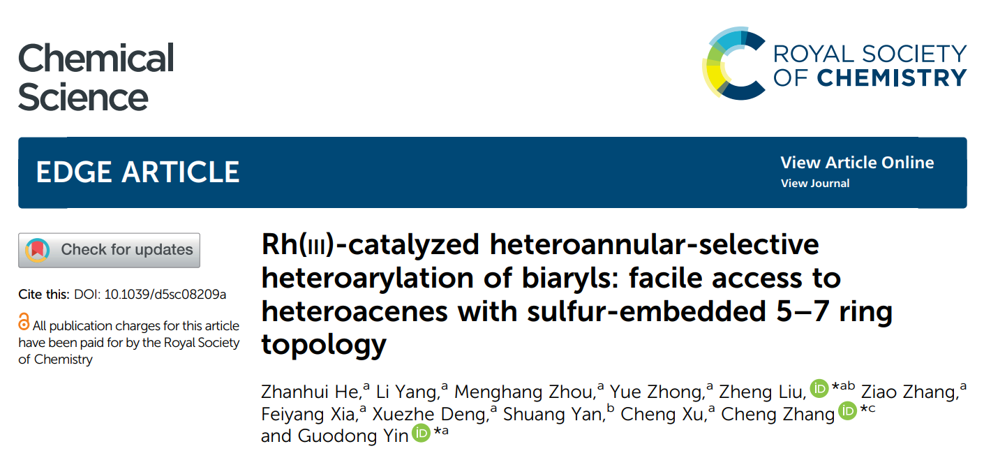 今年元月,Chemical Science(《化学科学》)在线发表该团队题为“Rh(III)-Catalyzed heteroannular-selective heteroarylation of biaryls: facile access to heteroacenes with sulfur-embedded 5-7 ring topology”(铑(III)催化联芳烃异环选择性杂芳基化反应:快速构筑具有硫原子嵌入5-7环拓扑结构的稠环芳烃)的研究论文。我院2023级硕士研究生何展辉为论文第一作者,殷国栋教授、刘郑副教授和四川大学张程研究员为通讯作者,伟德victor1946为第一通讯单位。Chemical Science是2010年由Royal Society of Chemistry(英国皇家化学会)出版社发行的化学领域综合性期刊,是中科院一区TOP期刊、自然指数(Nature Index)期刊,最新影响因子为7.5。