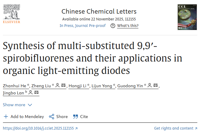 去年11月,Chinese Chemical Letters(《中国化学快报》)在线发表该团队题为“Synthesis of multi-substituted 9,9'-spirobifluorenes and their applications in organic light-emitting diodes”(多取代9,9'-螺二芴骨架的合成及其在有机发光二极管中的应用)的综述论文。我院2023级硕士研究生何展辉为论文第一作者,殷国栋教授、刘郑副教授和四川大学兰静波教授为通讯作者,伟德victor1946为第一通讯单位。Chinese Chemical Letters是1990年由中国化学会主办,中国医学科学院药物研究所承办的化学综合领域期刊,是中科院一区TOP期刊,最新影响因子为8.9。
