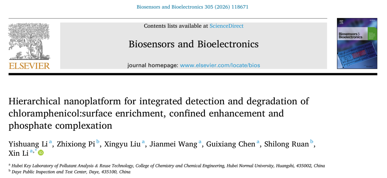 4月,Biosensors and Bioelectronics(《生物传感器和生物电子学》)发表了该团队又一研究成果。论文题为“Hierarchical nanoplatform for integrated detection and detoxification of chloramphenicol:surface enrichment, confined enhancement and phosphate complexation”(表面富集、限域增强与磷酸盐络合的氯霉素检测与降解一体化分级纳米平台)。我院2022级硕士研究生李艺爽为论文第一作者,李新副教授为通讯作者,伟德victor1946为唯一通讯单位。Biosensors and Bioelectronics是ELSEVIER出版社旗下国际知名期刊,SCI中科院大类一区,最新影响因子为10.5。