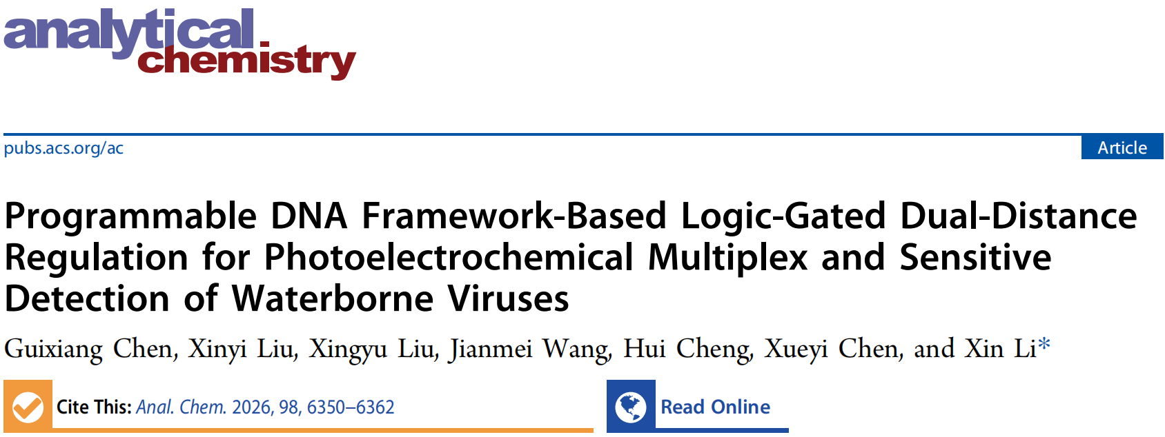 2月,Analytical Chemistry(《分析化学》)在线发表该团队题为“Programmable DNA Framework-Based Logic-Gated Dual-Distance Regulation for Photoelectrochemical Multiplex and Sensitive Detection of Waterborne Viruses”(可编程DNA框架逻辑门赋能双重距离调控PEC多元灵敏检测水环境病毒)的研究论文。我院2023级硕士研究生陈桂香为论文第一作者,李新副教授为通讯作者,伟德victor1946为论文唯一通讯单位。Analytical Chemistry是American Chemical Society(美国化学会)出版社旗下收录分析化学领域相关研究成果的顶级期刊,中科院SCI化学大类一区期刊、自然指数期刊,最新影响因子为6.7。