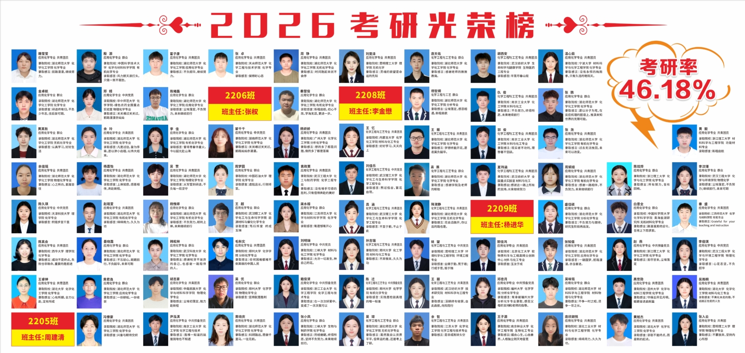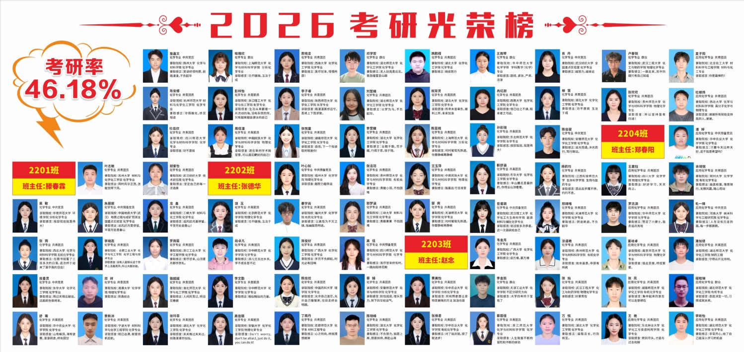 日前,2026年全国硕士研究生招生录取工作全部结束。我院2026届本科生被国内各高校、科研院所共录取157人,占毕业生总数(优师计划除外)的46.18%,考研录取率再创新高,连续三年超过40%。